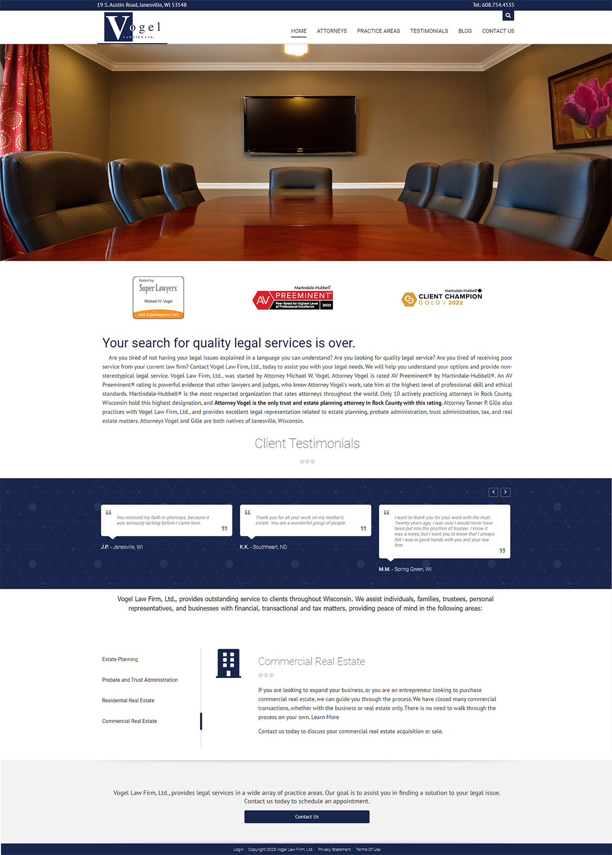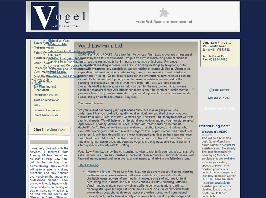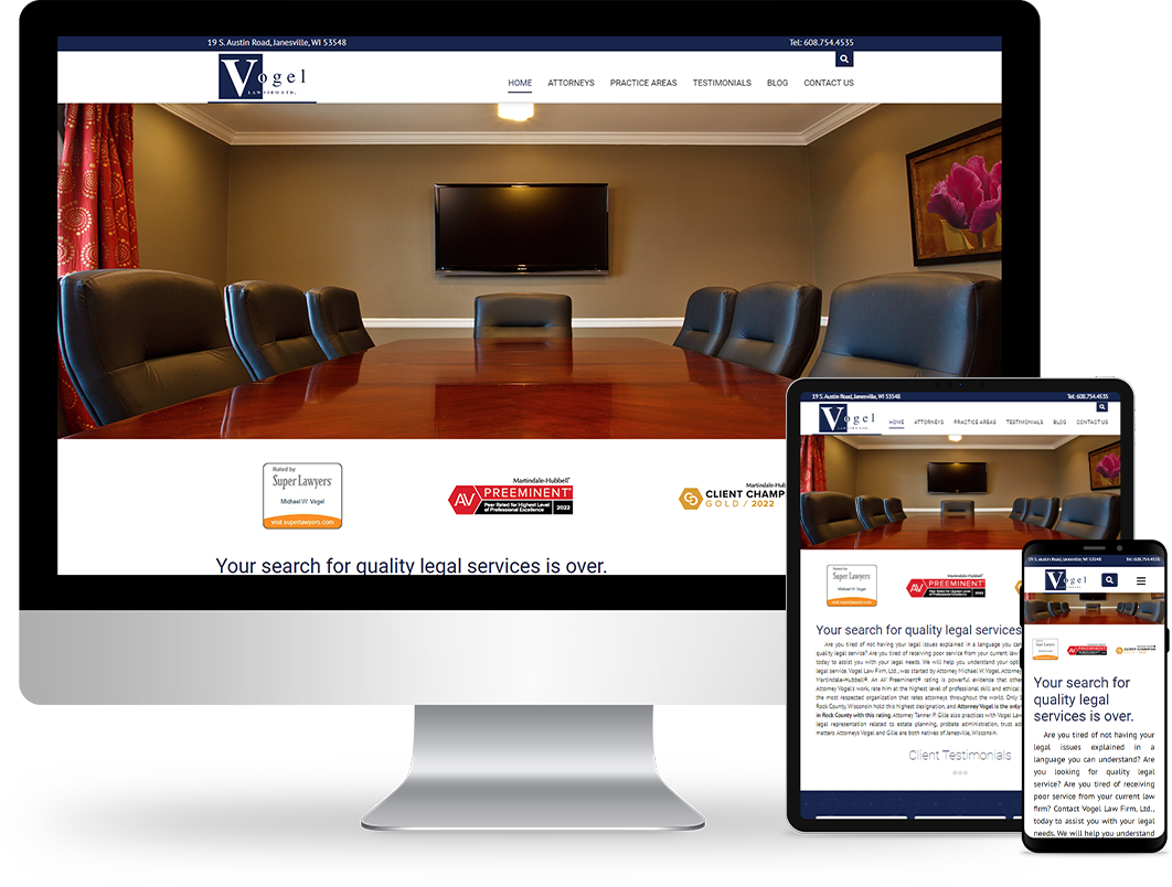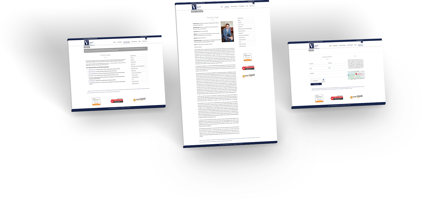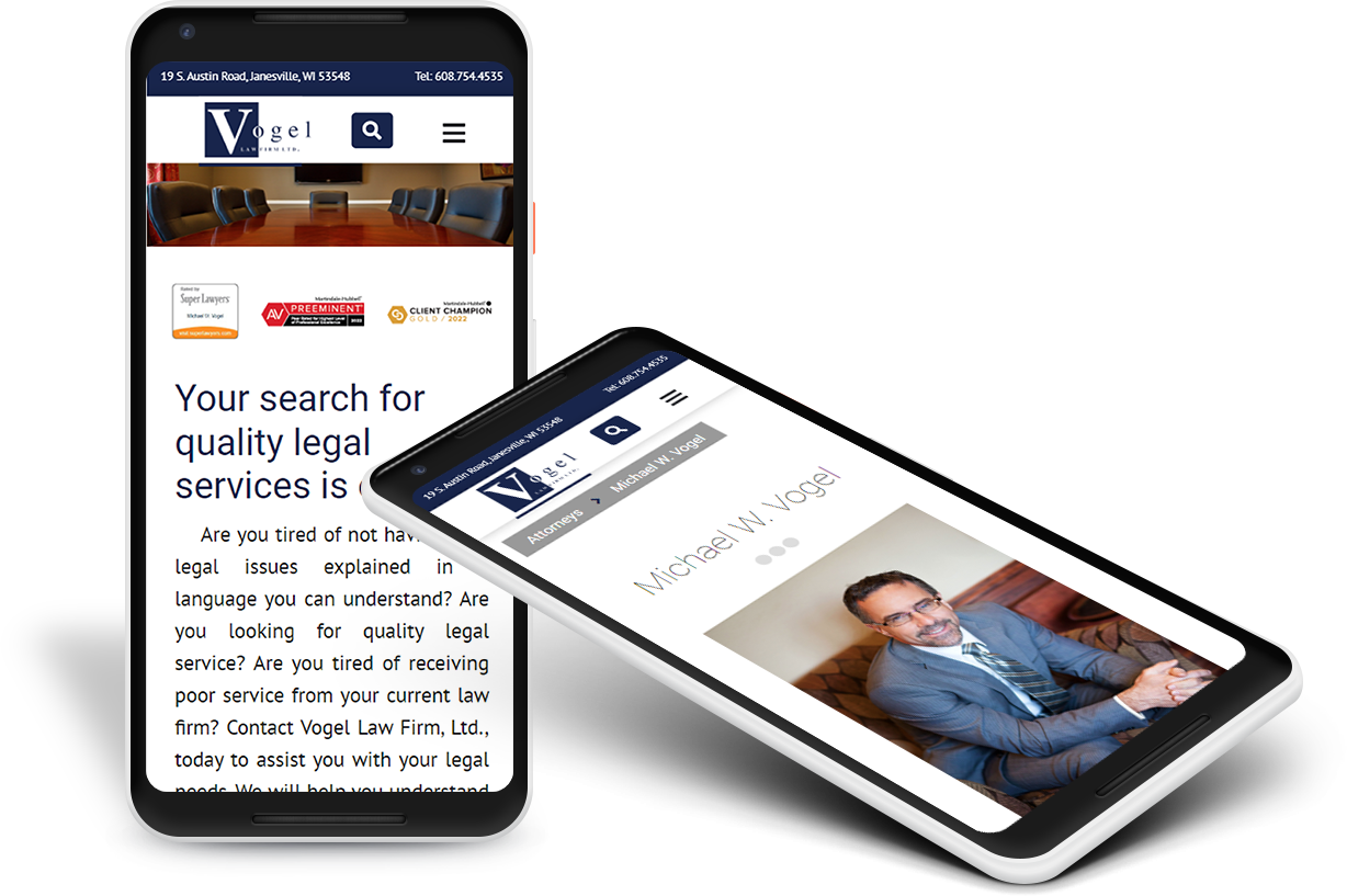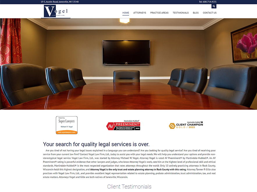 Vogel’s old website was very content-heavy. While information is important, too much can be overwhelming. We added a colorful image of their professional conference room to the top of the homepage and replaced the three-column layout with a single column of text. We wanted to showcase the firm’s awards, so we created colorful graphics touting their achievements and placed those right beneath the header photo. And because word of mouth is the most impactful way for a law firm to land new clients, we created a slider and placed customer testimonials front and center. Together, these additions go a long way toward establishing authority and trustworthiness.